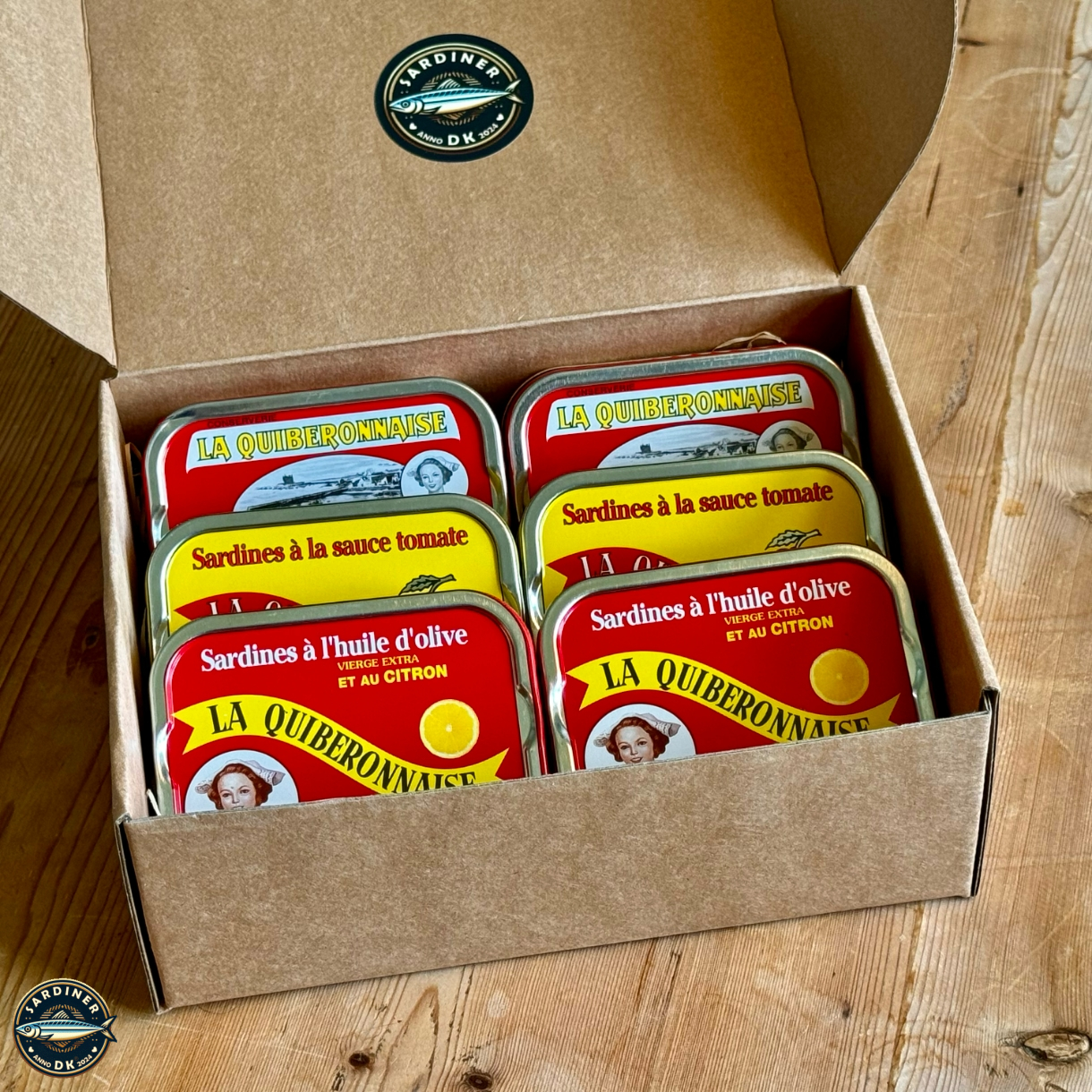 Alle dåser med La Quiberonnaise-sardiner er årgangssardiner ” Millésimées”, og på dåsen finder du et stempel med årstallet for den sæson de er fanget i. Ligesom god vin forbedres de ved lagring, hvor de opsuger den omgivende kvalitetsolie, og med tiden udvikler en endnu mere delikat og fuldendt smag og mørhed.