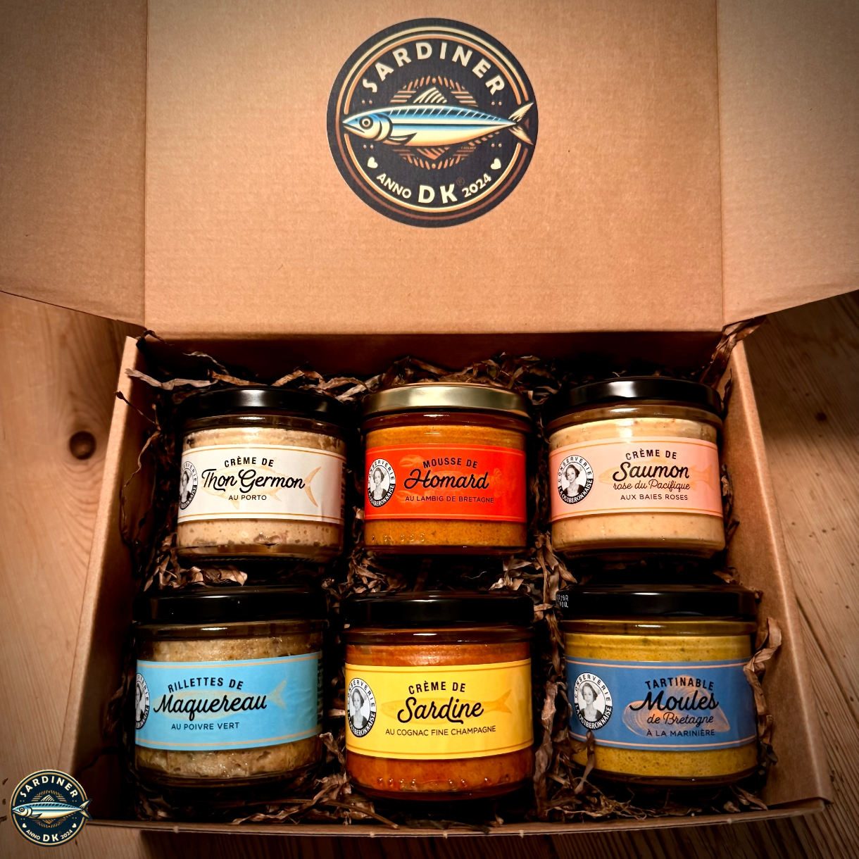Dette er gourmetkonserves af kun de fineste vildfangede fisk, hummer og muslinger, hvor smagen er løftet med vine, havsalt og pikante urter. Kassen indeholder: